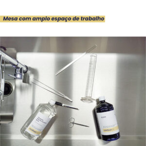 A MM19 está equipada com conexões de água fria e quente (½ polegada) e uma ligação de águas residuais de 2 polegadas, facilitando a limpeza e manutenção da área de trabalho. Além disso, esta mesa de macroscopia inclui diversos acessórios essenciais, como 02 beckers de aço inox ANSI 316, uma régua imantada de 350 mm, uma peneira de aço inox para a cuba e uma tábua de dissecção. A régua de aço inoxidável de 30 ou 40 cm também permite medir com precisão as peças manipuladas.