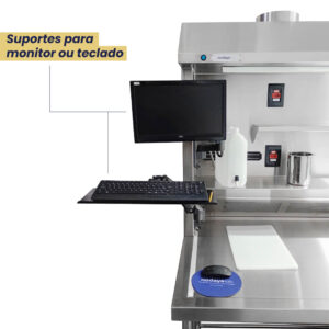 Com dimensões de 1300 mm de largura, 800 mm de profundidade e 1900 mm de altura, a Estação de Macroscopia MM19 oferece um amplo espaço de trabalho, otimizado para laboratórios que lidam com o fatiamento de amostras. O sistema de exaustão possui uma capacidade ajustável de 650 a 1040 m³/h, assegurando que o ar seja constantemente filtrado e renovado. A tela perfurada na frente da área de trabalho maximiza a eficiência da filtração, mantendo o ambiente livre de vapores nocivos.